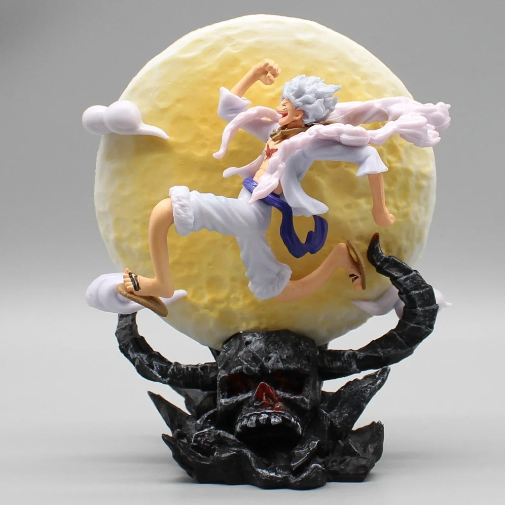 Luffy, dans sa forme Gear 5, semble bondir vers le ciel, soutenu par un socle sculpté en forme de tête de démon surmonté d’une pleine lune lumineuse. L’éclairage intégré met en valeur chaque détail, rendant cette figurine aussi spectaculaire de jour que de nuit.
