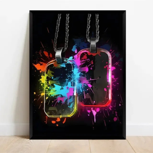 Ajoute une touche de caractère à ta décoration avec ce tableau original représentant des plaques militaires stylisées éclatant de couleurs vives sur un fond noir intense.